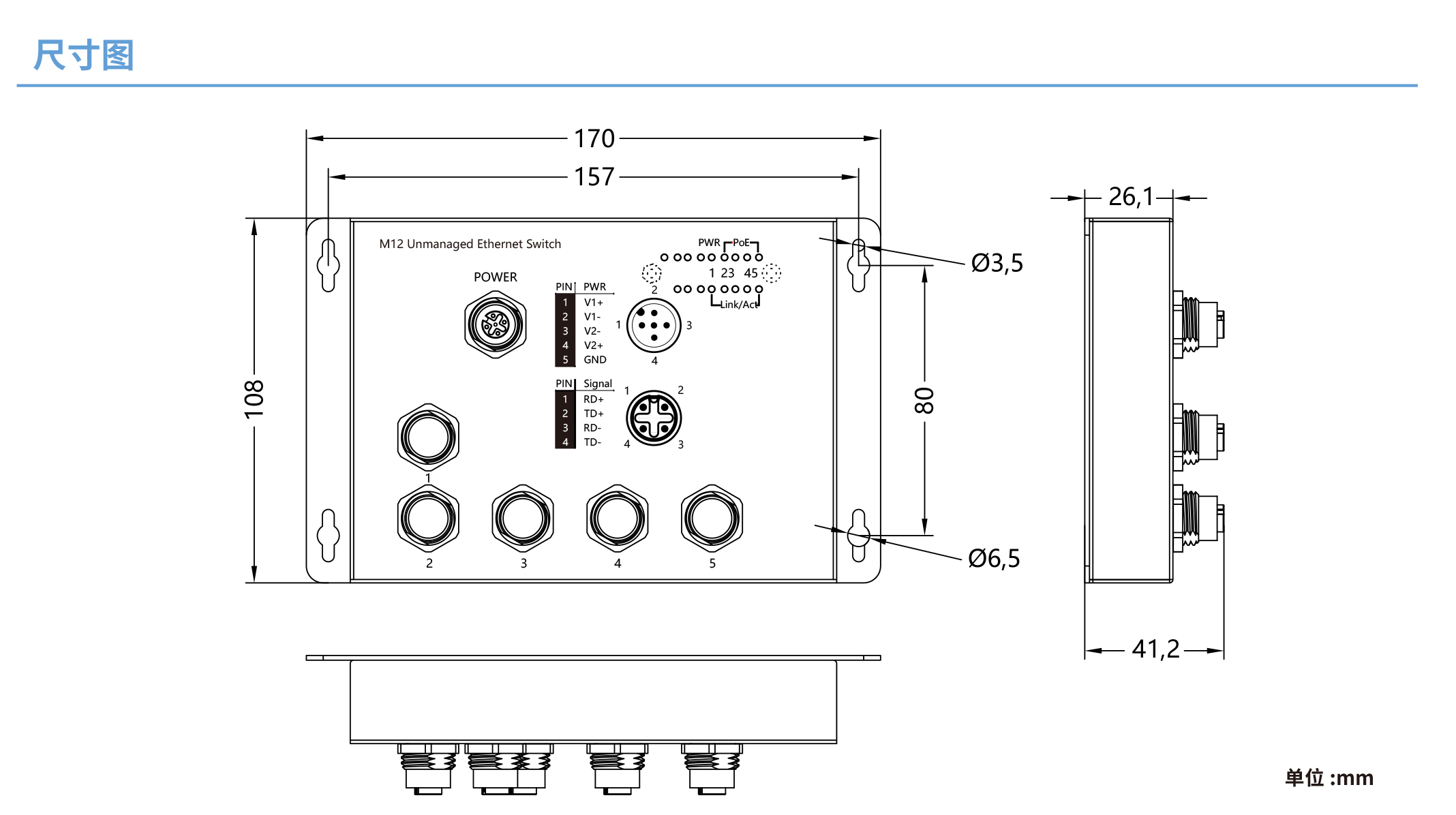 电口 | 5 x M12 A-coded, 4 pin, 母头接头 |