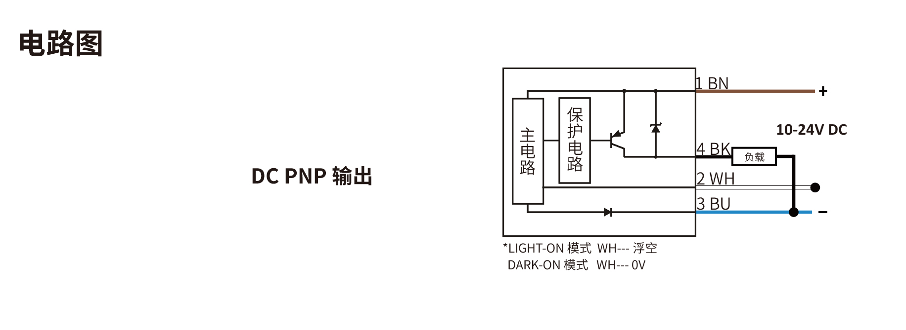 | 集电极开路输出(NPN/PNP 输出根据形式而不同)白线不接入光时ON/ 白线接入蓝线遮光时ON 的切换方式 | |